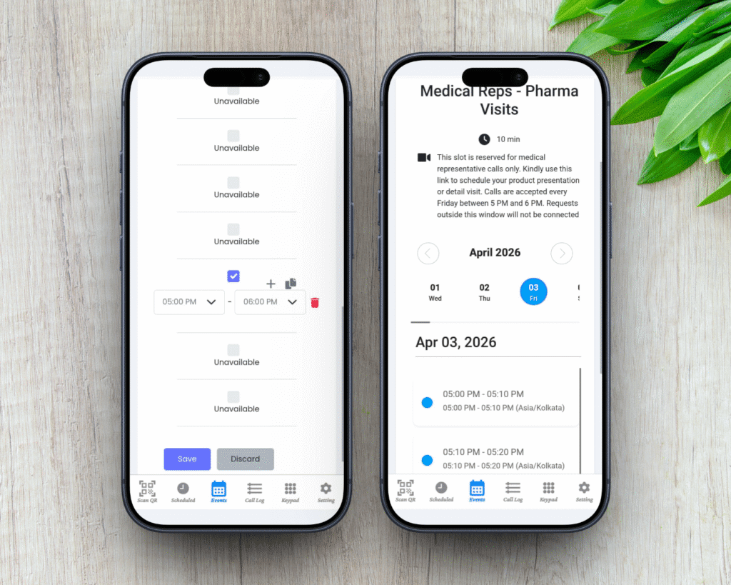 Yes. The profile is registered under the nurse’s mobile number by default. She manages all scheduling, call requests, approvals, and group assignments throughout the day. Before the doctor’s consultation window opens, she switches the profile number to the doctor’s mobile. After the window closes, she switches it back. The doctor receives calls only during that window and is completely unreachable outside it – without changing any app settings or carrying a second device.